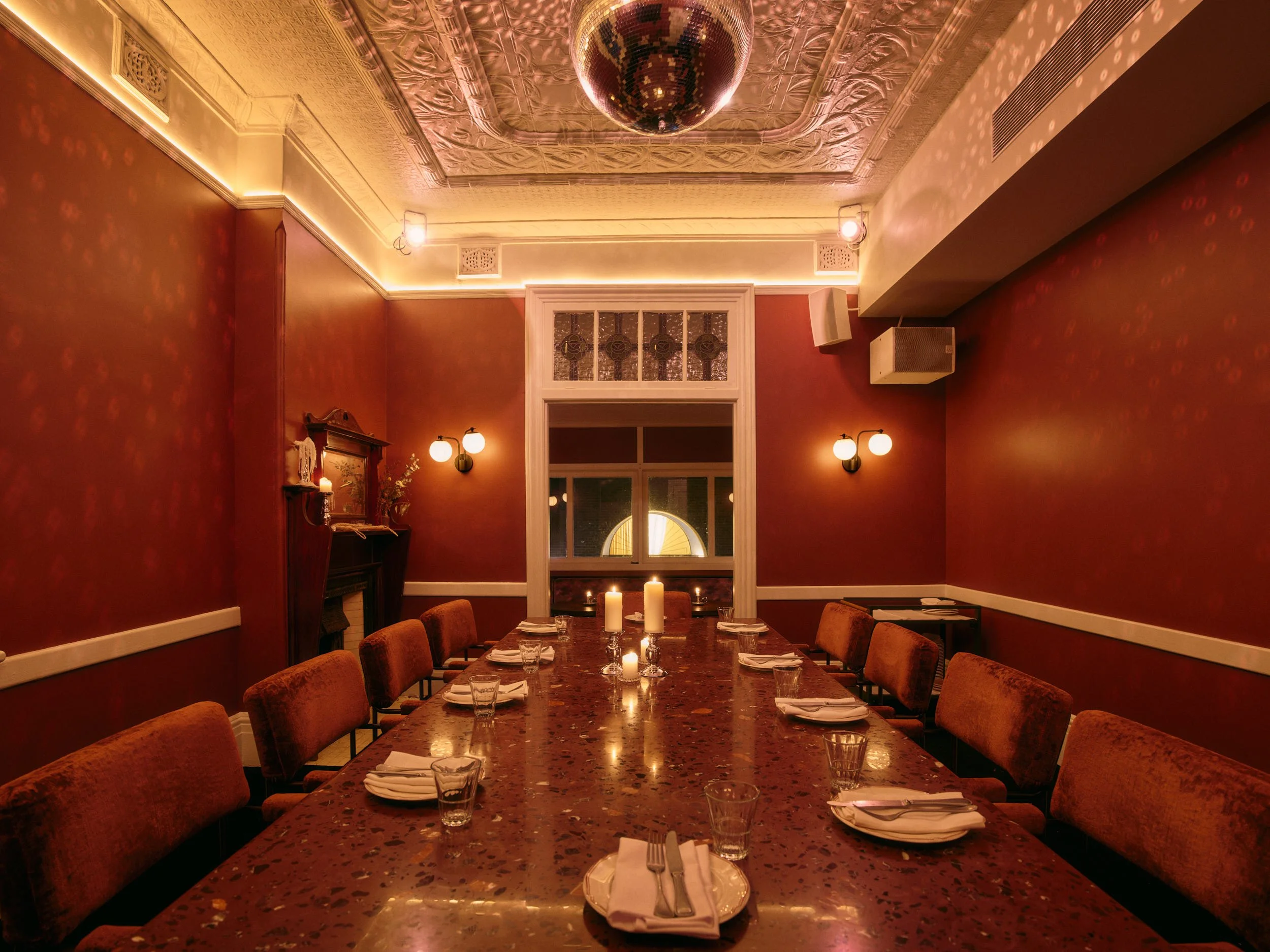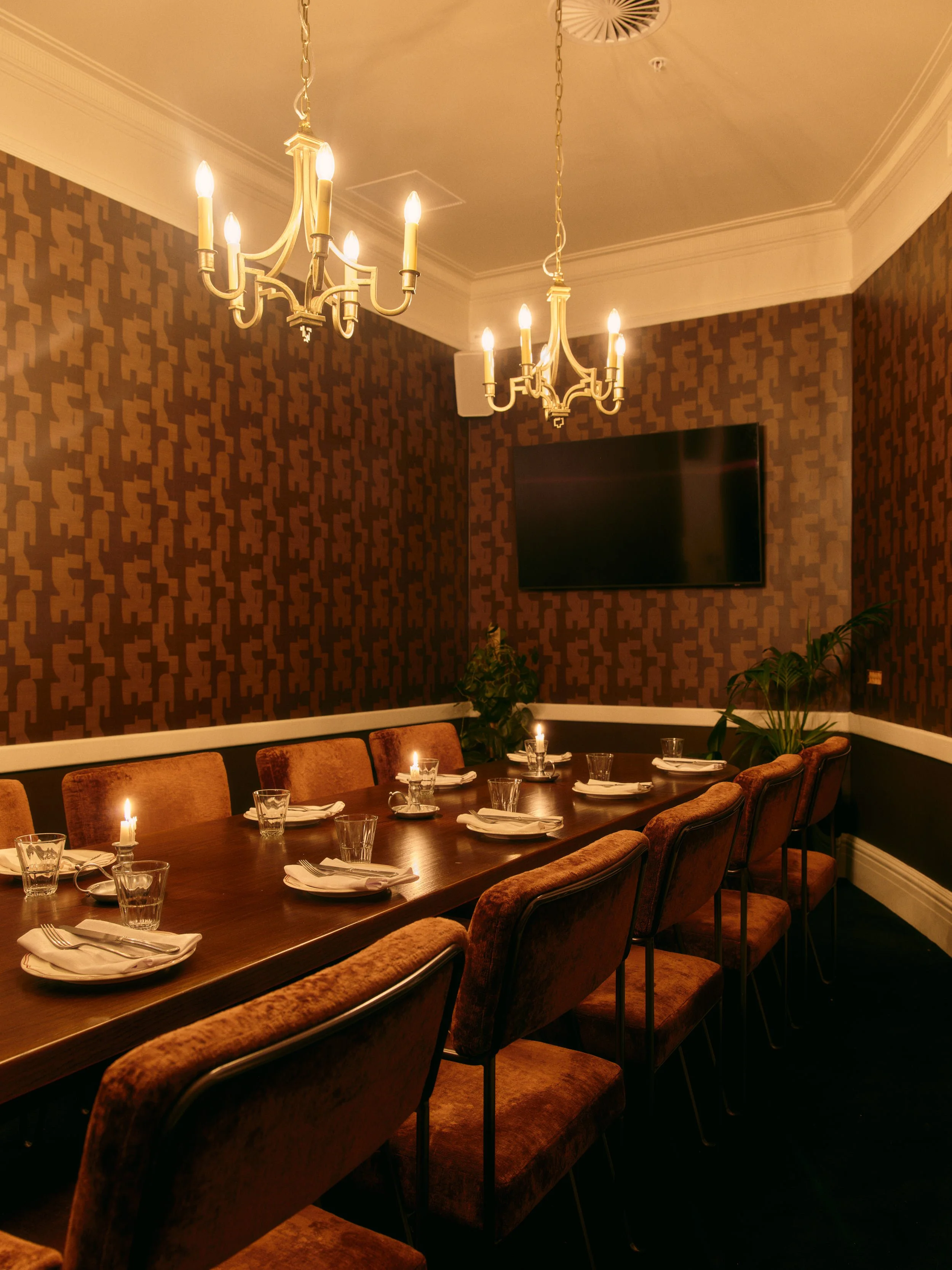A relaxed private dining room with a long table for up to 14 guests. Easy, welcoming, and designed for groups who want their own space.